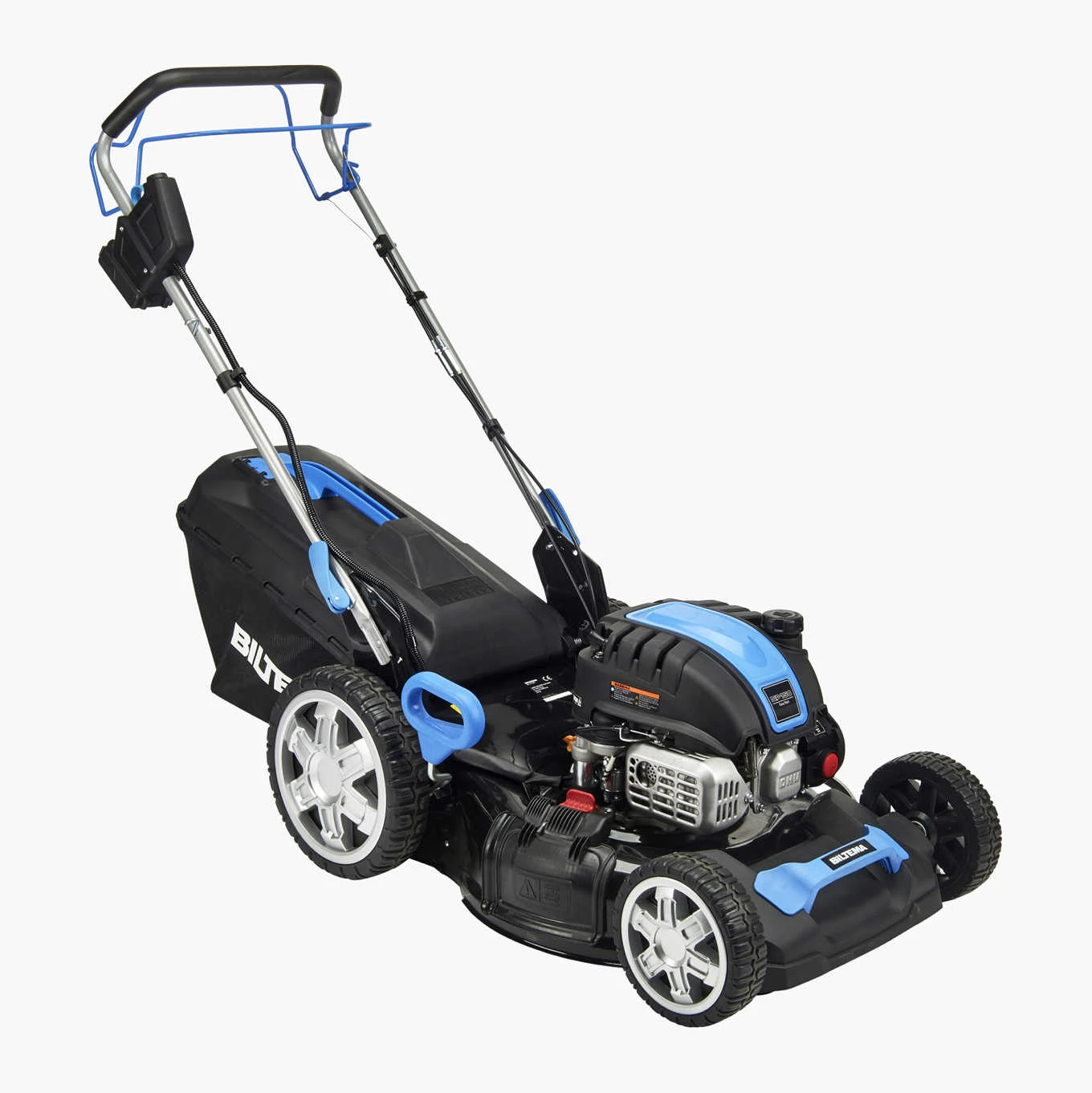 Selvkørende, benzindrevet plæneklipper med startbatteri, der gør det nemt at starte blot med et tryk på en knap. Vælg mellem sideudkast, græsopsamler eller bioklip, der findeler græsafklippet. Batteri og lader er inkluderet.