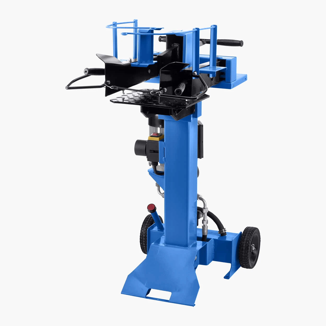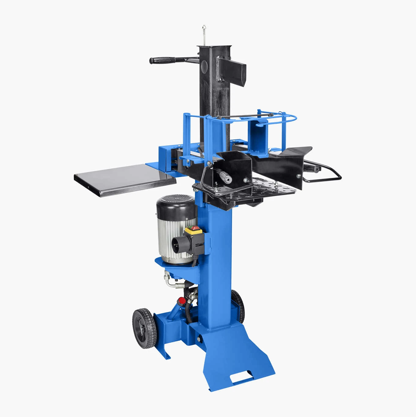Stående model med transporthjul, ekstra sidebord og tohåndsgreb for høj sikkerhed. Justerbar kløvelængde gør det muligt at øge arbejdstempoet for mindre brændestykker. Til kævler med diameter 80–300 mm og længde 250–550 mm.
