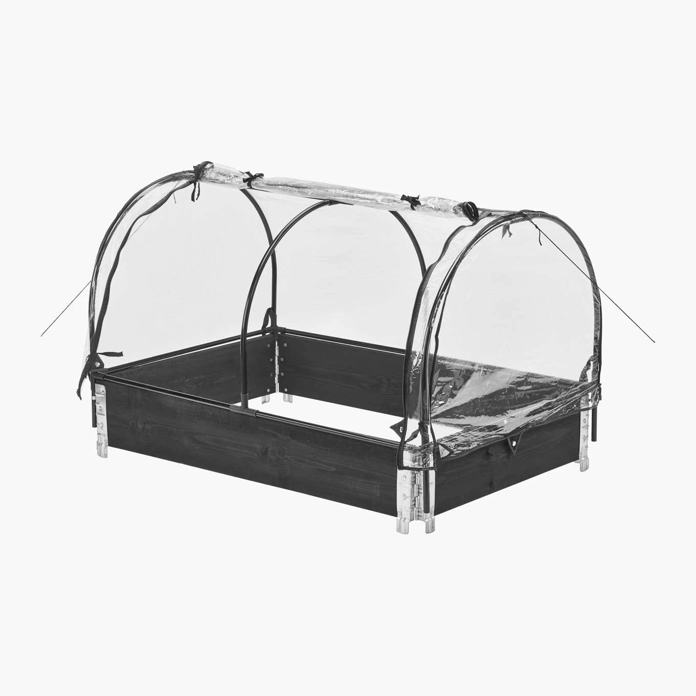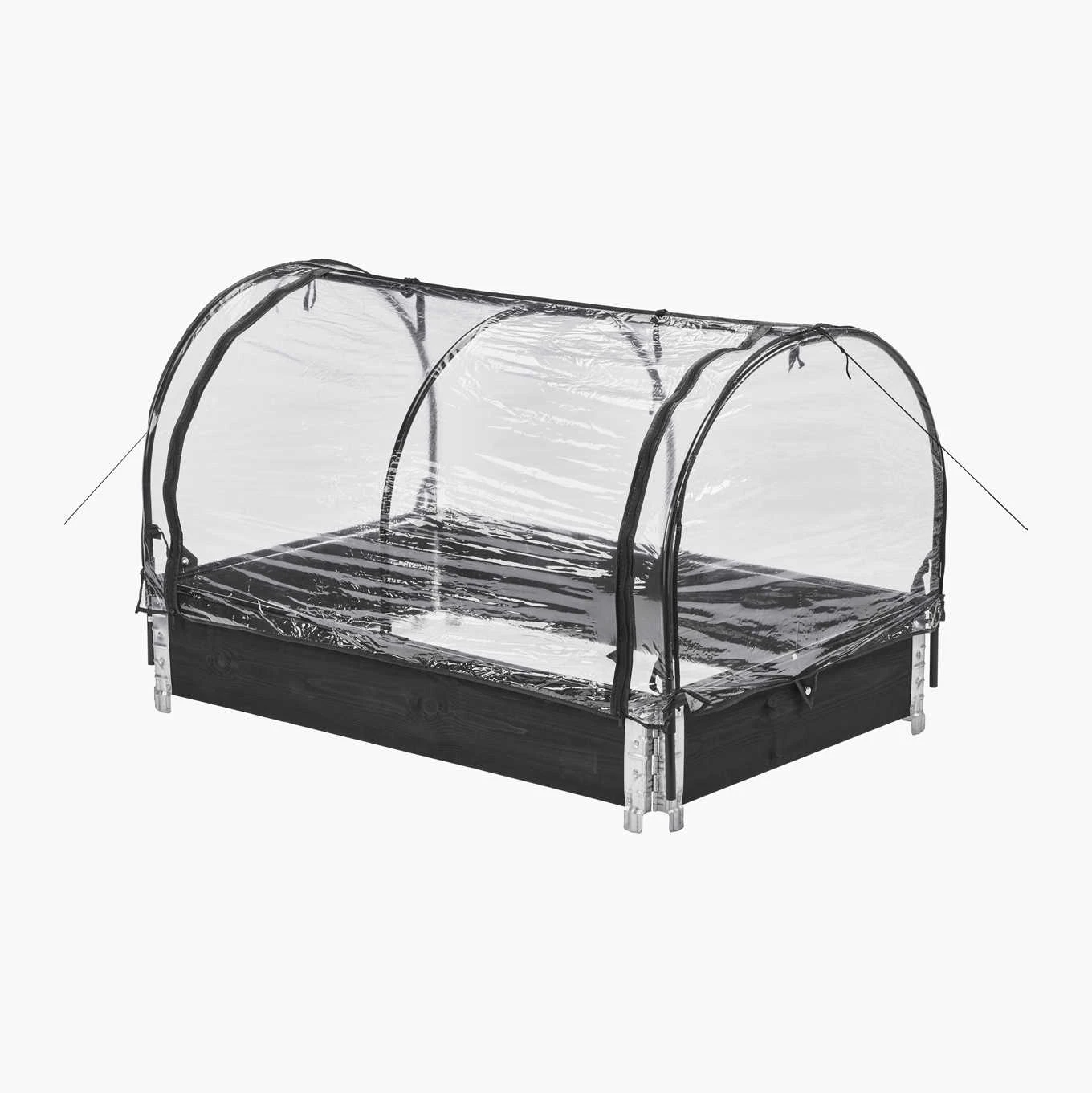 Cylinderformet drivhus der passer til dyrkningskasse/palleramme. Letmonteret metalstativ med åbninger på langsiderne med lynlåslukning til udluftning, pleje og høst. Plastdugen klikkes fast i de medfølgende trykknapper, der skrues fast på pallerammen.