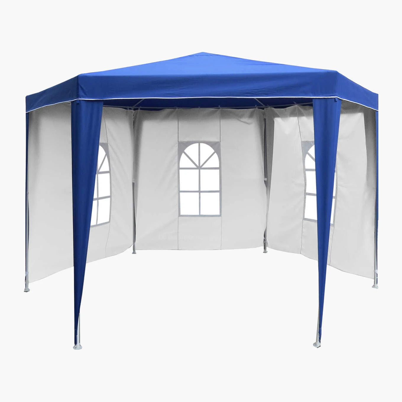 Stort og rummeligt partytelt med seks kanter med en bredde på 1,8 meter. Tre vægsektioner med vinduer. Let at stille op med ramme af 25 mm stålrør. Teltpløkker og barduner medfølger. Tag af polyesterstof 160 g/m2, vægge 140 g/m2. Højde: 2,45 meter.