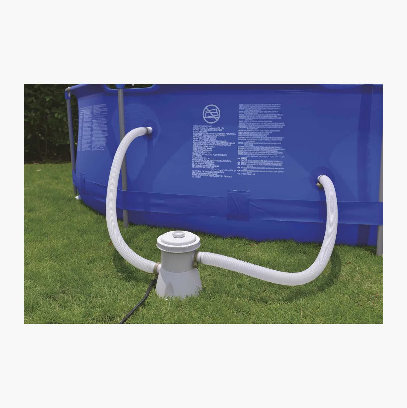 Poolfilterpumpen er let at installere. Du placerer filterpatronen i den holdbare, rustfri filtertank og skruer låget på. Du slutter derefter slangerne til poolens ind- og udløb. Du starter pumpen ved at sætte stikket i en jordet stikkontakt.