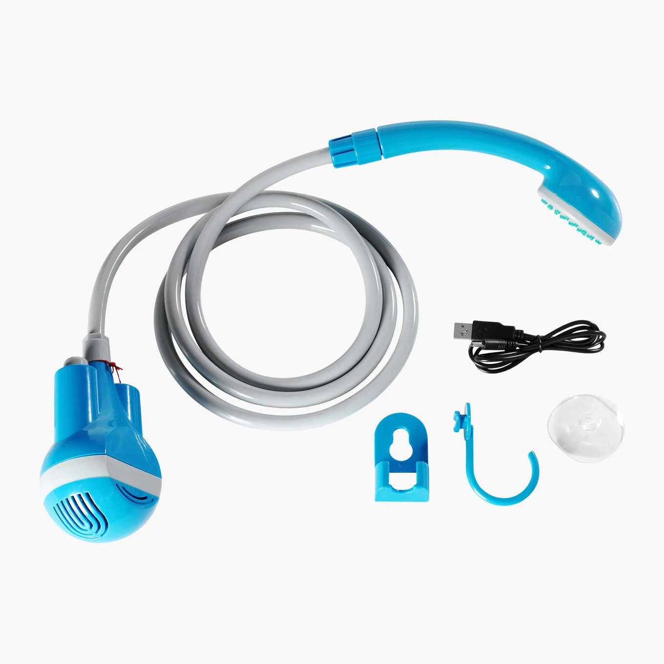 Pumpe, 1,8 m bruserslange, bruserhåndtag, ophængskrog og sugekop medfølger. Oplades via medfølgende USB kabel. Pumpen har automatisk stop, der standser pumpen, når batteriniveauet er for lavt. Pumpen er også forsynet med filter.