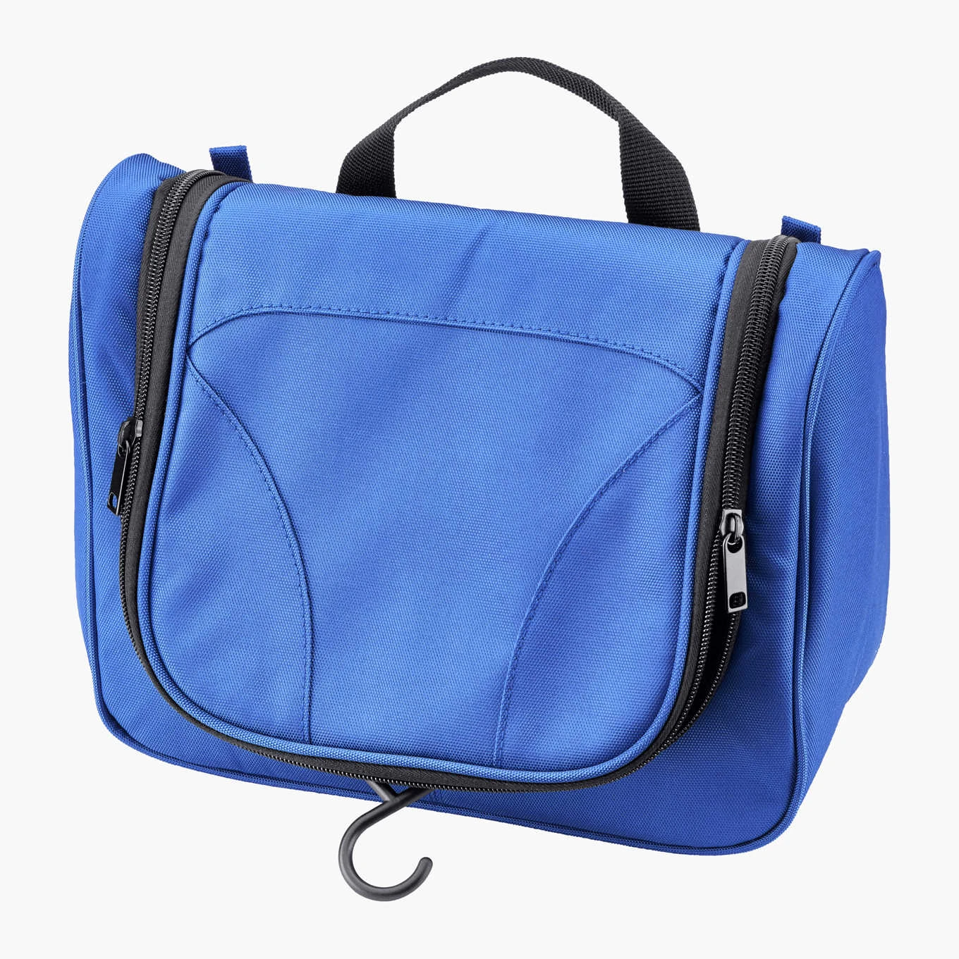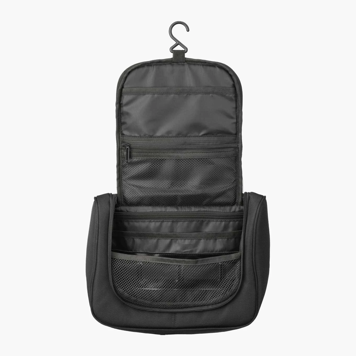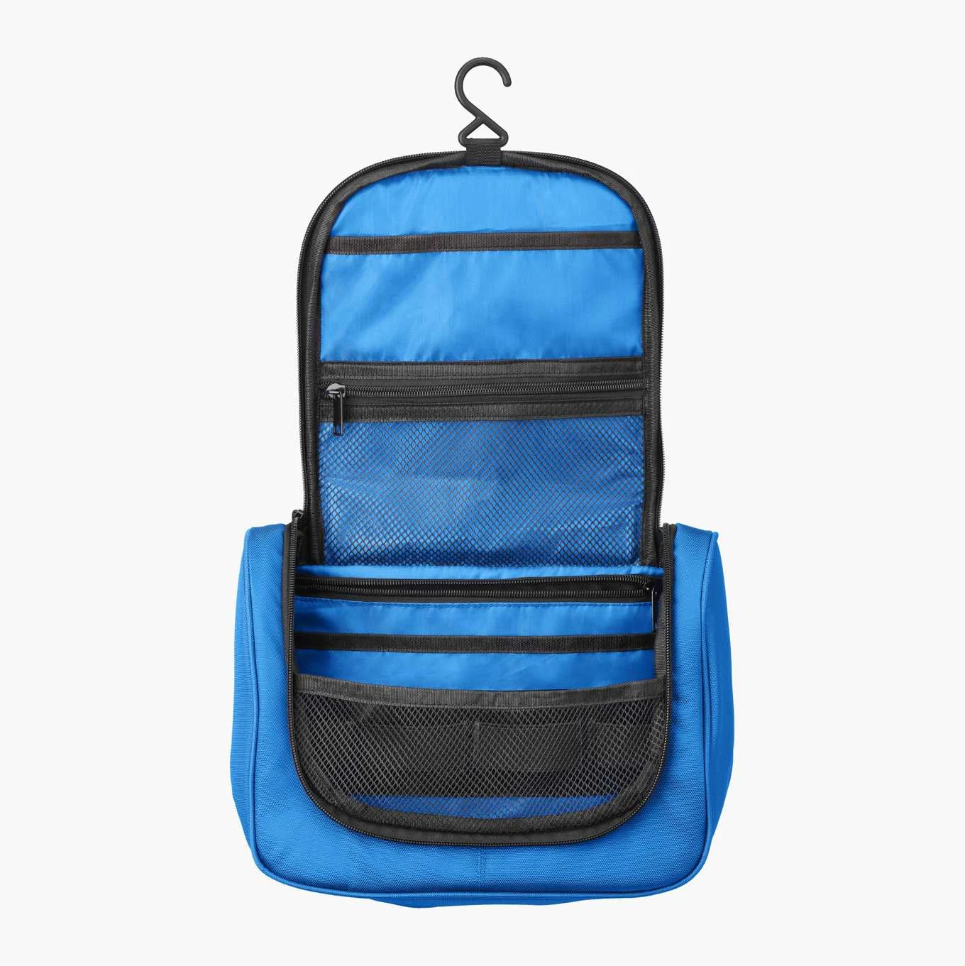 Toilettaske med praktisk ophængskrog, der gør det nemt at hænge den op, når den er åben. Den har flere rum og lommer i forskellige størrelser, nogle er åbne og nogle har lynlåse. Håndtaget gør den let at bære, når den er lukket. Fremstillet af polyester. Dimensioner: (L) 26 x (B) 19 x (H) 11 cm.