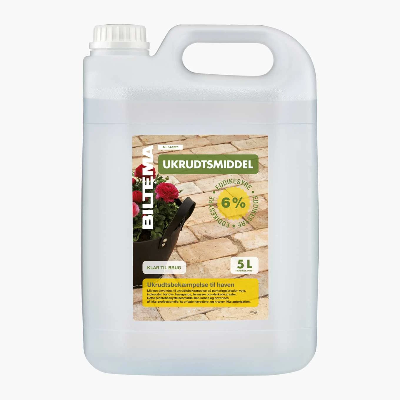 Ukrudtsbekæmpelse mod uønsket vegetation i haver og på offentlige steder. Effektivt hvor det er svært at komme til, så som passager, fortove og mellem sten- og betonplader. Sprøjtes eller vandes direkte på ukrudtet. Effekten kan ses allerede efter et par timer. Efter 2 – 3 dage er ukrudt visne helt. OBS! Må ikke anvendes i lukkede rum som drivhuse osv., da dampene kan beskadige anden vegetation. Undlad at forurene vand med produktet eller dets beholder. 5 l (strækker til 25 m²).