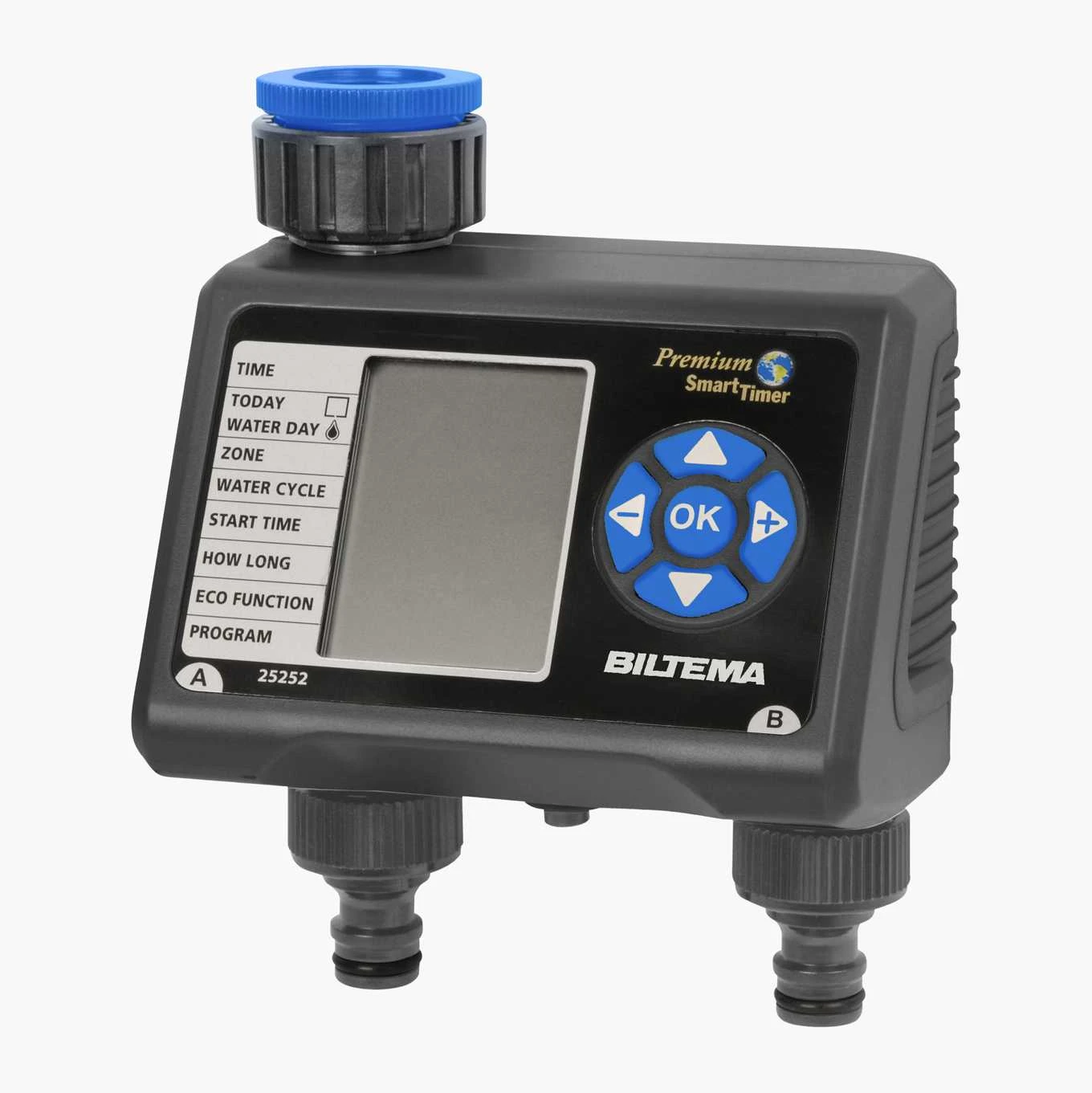 Tids- og vandbesparende timer der let tilsluttes vandslanger med standardkoblinger. Elektronisk, drives med batteri: 2 x AA.